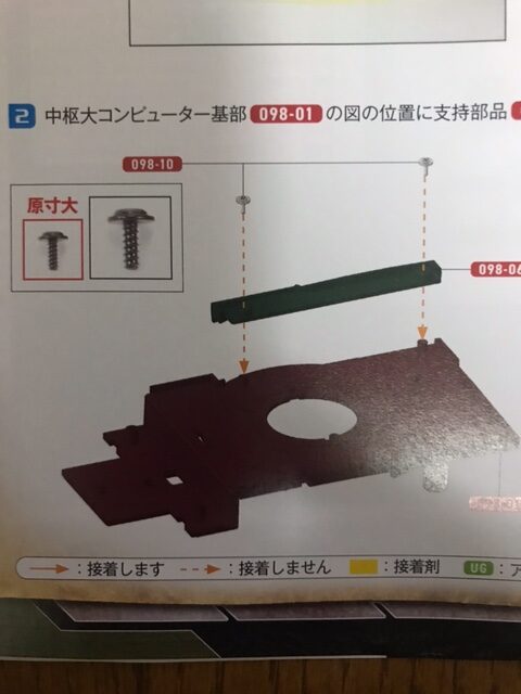 中枢大コンピューター基部098-01の図の位置に支持部品098-06を合わせ、ネジ098-10で2ヵ所を固定する。