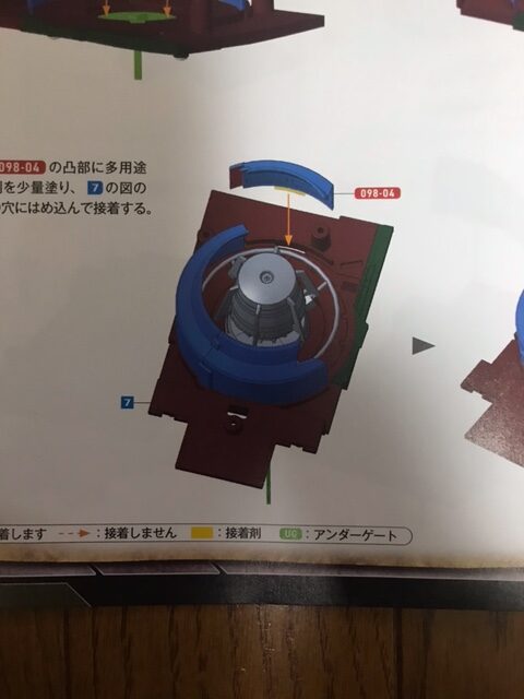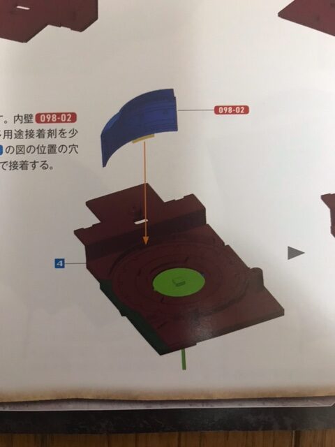 裏返す。内壁098-02の凸部に多用途接着剤を少量塗り、図の位置の穴にはめ込んで接着する。
