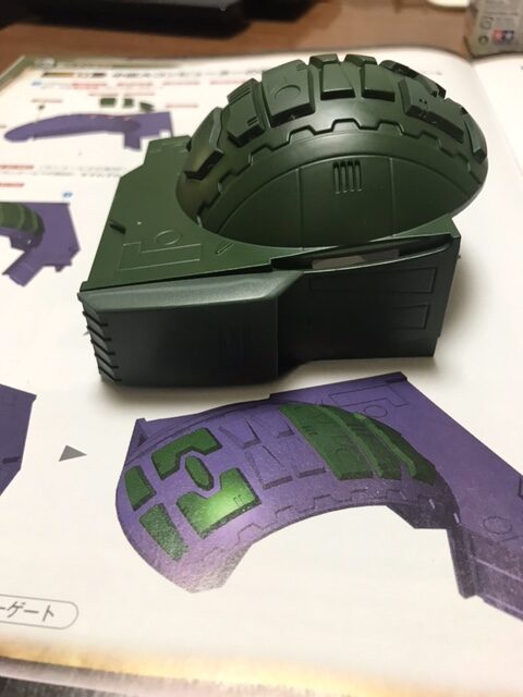外殻部品100-02-A、100-02-B、100-02-C、100-02-Dをそれぞれランナーから切り離して裏面に多用途接着剤を少量塗り、外殻100-01の図の位置に接着する。
