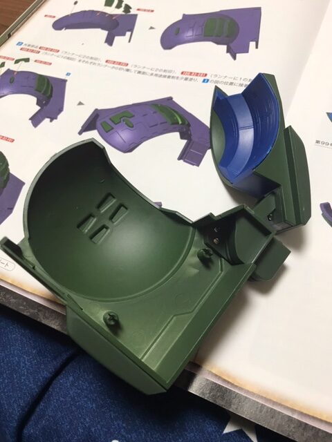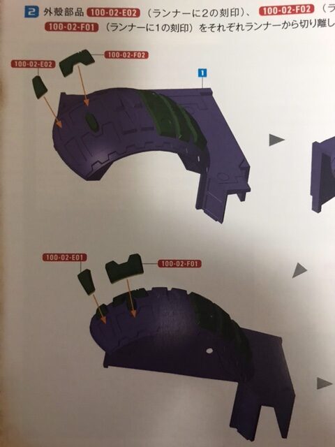 外殻部品100-02-E02、(ランナーに2の刻印)、100-02-F02(ランナーに2の刻印)、100-02-E01(ランナーに1の刻印)、100-02-F01(ランナーに1の刻印)をそれぞれランナーから切り離して裏面に多用途接着剤を少量塗り、図の位置に接着する。